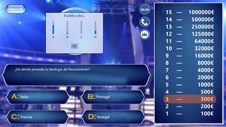 Juego de preguntas y respuestas donde el concursante debe acertar el máximo número de preguntas sin fallar, con la posibilidad de hacer uso de tres comodines que le ayudarán a la respuesta. Esta aplicación ha sido diseñada por alumnos del IES Nervión de Sevilla, en el Ciclo Formativo de Desarrollo de Aplicaciones Multiplataforma.