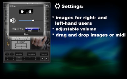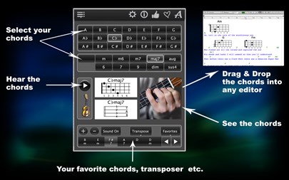 DESCRIPTION Play the ukulele chords right away - no experience required! The app contains all necessary chords to be able to play all your favorite songs! Take advantage of clear, easy-to-use interface and learn the basic and advanced chord charts. You can: - see the chords standard string representation, in TAB-representation and as coloured photos, - listen to the chords you picked with original instrument sound, - drag and drop pictures with chords to your documents, - create, save and load the chords of your favourite songs, - transpose the chords to level which is optimal for you.