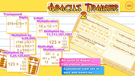 Abacus Trainer 2 is a question generator made in accordance with the skills acquired in rapid calculations. It provides a whole range of options that can be flexibly selected to fit the drilling needs. The immense pool and combination of questions enhance the learning interest. Exercises can be set on any kind of vedic maths calculations including multiplicative pithy formula. Flexible answer input can be entered either by using abacus or numeric keys.