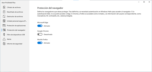 Protección del navegador Puede definir los navegadores que desea proteger. Tras definirlos, se necesitará autenticación en Windows Hello para acceder al navegador. Si la autenticación falla, no se podrá acceder a Edge. A Chrome y Firefox se accederá como invitado, lo que significa que la información del usuario correspondiente, como marcadores, ID, contraseña, etc., estará protegida.