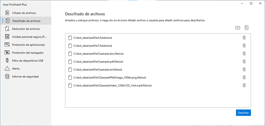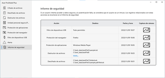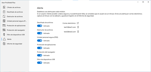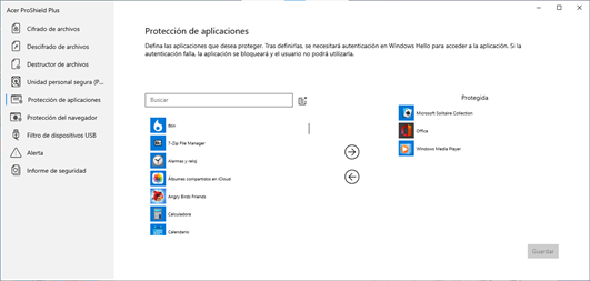 Acer ProShield Plus incluye módulos que protegen su dispositivo de accesos no autorizados e intrusiones. ● Cifrado de archivos ● Destructor de archivos ● Unidad personal segura (PSD) ● Protección de aplicaciones ● Browser Guard ● USB Device Filter