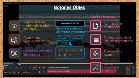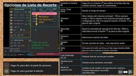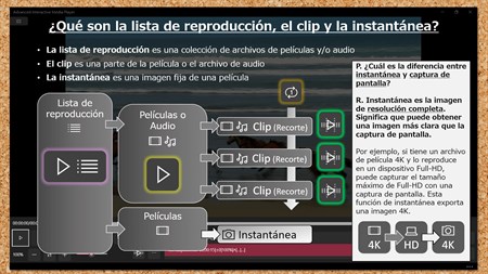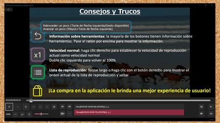 Principales características - Reproducir archivos de vídeo y audio Vídeos: .mp4, .mov, .wmv, .avi, .m4v, .mkv, .3gp, .mts Audios: .mp3, .wma, .wav, .m4a - Función "Volver-un-poco" y "Adelante-un-poco" conveniente - Botones de velocidad de reproducción fáciles de usar / control deslizante - Soporte de lista de recorte para reproducción parcial (hasta 10 listas de recorte gratis *1) - Rotar video - Instantánea de video (resolución de video nativa) - Crea tu propia edición de resumen con subtítulos - Modo de reproducción de recortes continuo - Exportar e importar la lista de recortes - Soporte para gestos - Saltar a la posición de tiempo especificada (toque la etiqueta de tiempo) - Soporte para listas de reproducción (Hasta 5 listas de reproducción de forma gratuita) - Modo de video de pantalla completa / pantalla - Grabadora de voz simple integrada *2 - Visor simple integrado de PDF *3 - Diseño adecuado para computadoras de escritorio, portátiles y tabletas