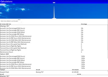 Track personal, entertainment, commuting and business flight hours and miles to compute Internal Revenue Code Section 280F Qualified Business Use percentages, Standard industry fare level (SIFL) imputed income amounts for personal use flights, IRC Section 274 entertainment and commuting expense disallowance amounts and SEC Incremental Costs for reporting for named executive officers. Track Internal Revenue Code Section 280F Qualified Business Use percentage thresholds which must be met or exceeded in the year of purchase to obtain bonus depreciation and to use accelerated depreciation methods, and must be met or exceeded in subsequent years to avoid depreciation recapture.