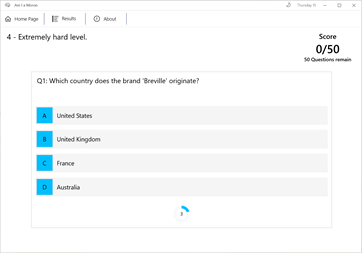 This is most likely the hardest quiz you will ever try. If you are a lover of pub quizzes Am I a Moron is a must. Four (4) increasingly difficult questions, the last with a 15 second time limit to answer. A lot of fun with new questions and answers added regularly.