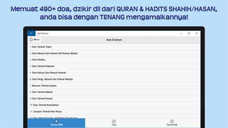 Keutamaan: •Memuat 500+ doa, dzikir, adab dll! Bersumber dari Quran & Hadits Shahih/Hasan (insya Allah, sesuai penelitian ahli hadits), anda bisa dgn tenang mengamalkannya! •Dilengkapi Dzikir Pagi Sore & Dzikir Setelah Shalat Fardhu! Cocok dijadikan app wirid/doa harian anda! •Fitur "Cari"! Mencari doa/dzikir yg anda inginkan, tinggal ketik! •Fitur "Favorit"! Punya doa/dzikir yg anda senangi? Simpan ke favorit agar mudah dimunculkan lagi! •Ukuran teks bisa diubah! Teks arab/lainnya terlalu kecil? Silakan ubah sesuai selera anda! •Tersedia "Mode Malam"! Tidak silau saat baca doa di tempat gelap! •Berbagi ke medsos, chat dll! Nikmati limpahan pahala sebanyak yg mengamalkannya! •Bekerja offline! Tidak perlu internet saat menggunakannya! •GRATIS!! Tidak dibatasi waktu, tidak ada fitur yg dimatikan, semuanya FULL!