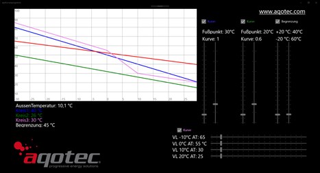 Zur einfachen Anwendung wurde von aqotec ein Tool entwickelt, um die eingestellte Heizkurve relativ einfach grafisch darzustellen und mittels Cursor Werte auszulesen