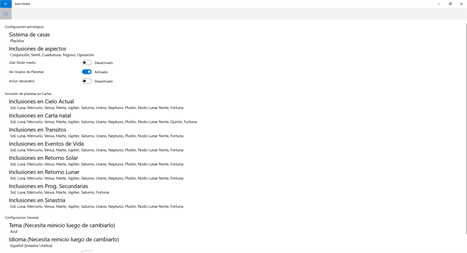 Astro Nobel incluye información sobre nodos lunares, Lilith, asteroides (como Quirón, Ceres, Palas, Juno y Vesta) y partes árabes (fortuna, desgracia); puedes configurar qué planetas se incluyen en cada tipo de gráfico.