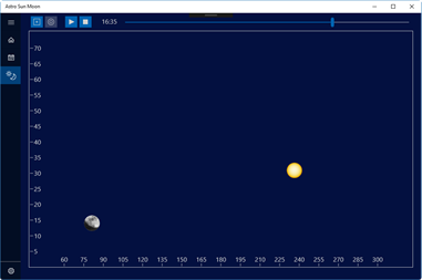 Astro Sun Moon displays the current data of sun and moon, astronomical date and zodiac sign. The app also includes a sun and moon calendar with the dates for sunrise, culmination, sunset, moonlight and moon phases of the next 30 days. In an additional view, the position of sun and moon can be displayed graphically and their movement during the current day can be animated.