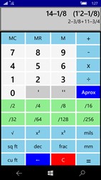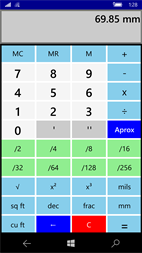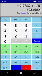 A basic inch calculator that is a companion to the ruler, measuring tape, caliper, or any other measuring device reading Imperial or American Standard units. - No ads; - All basic operations, addition, subtraction, multiplication, and division, are performed in inch and standard fractional inch, with the result also in inch and standard fractional inch, making it easy to relate back to the scale for any practical means; - Irrational value results are always translated to a fractional inch by rounding to the closest standard fraction while providing the accuracy; - “Aprox” function allows for finding better suitable values by rounding to the next best practical standard fraction (saves all approximations); - Input and output are intuitive; - Standard fractional values are entered as a one-key tap (click); - All basic operations are repetitive, and they are done in the input order; - Memory function allows for more complex operations; - Find decimal equivalent for any entered or computed fractional value; - Transform results to mils (thous); - Get the exact or approximated standard fractional value for any decimal value (by using the “frac” function); - Get the corresponding metric (mm) value and more.