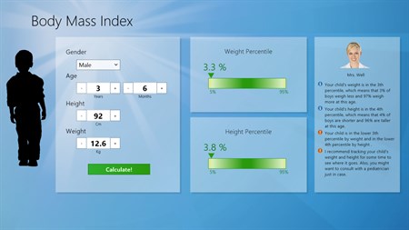 The most versatile and smart BMI Calculator for Windows 8, developed by Dr. Albert Smolyar! Works for adults, children, and even babies! Determine your Body Mass Index (BMI) and your ideal weight range. Check weight & height percentiles for your child, according to cdc.gov growth charts.