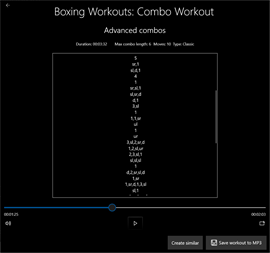 Boxing Workouts lets you create a custom workout for shadow boxing sessions. Generate workouts to target specific techniques or to master your own combos. The app will generate an audio workout of your desired length which you can save to MP3 to use anywhere (not in trial).