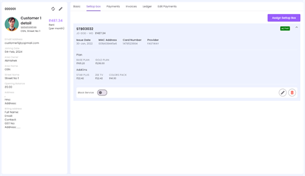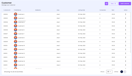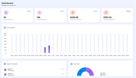 1. Manage Customers 2. Manage SetTop Boxes 3. Create Monthly Report 4. Maintain SetTop Boxes details with your provider 5. Collection Agent Mobile Application 6. Track Agent with Maps 7. Customer Geo Location, So that any agent can reach your connection address easily. 8. Multi different area owners in single application 9. Multi kind of reporting to get updated with your account. 10. Notification system. 11. and many more.