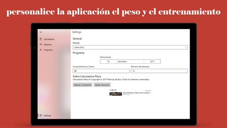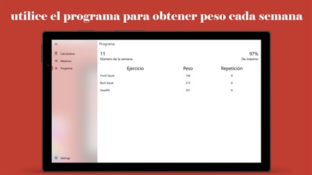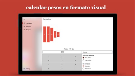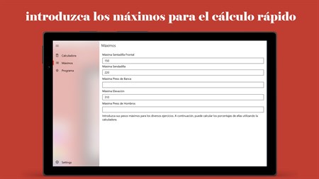 - Fácil de usar calculadora - Añadir máximos para el cálculo de los porcentajes - Crear un programa básico de entrenamiento - Soporta hasta 610lbs