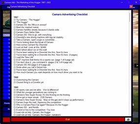 Camaro Ads - The Marketing of the Hugger 1967-2022. A Chevrolet officially licensed multimedia software title about the Camaro from HI-Tech Software. Take a nostalgic journey back to the beginning of the Camaro. See the very first Camaro ads as they appeared in magazines back in late 1966. Then follow the evolution of the "Hugger" up to the 2002 35th Anniversary SS edition and then see the rebirth of the incredible “retro” 2018 Camaro convertibles. This unbelievable collection (over 400) of almost every Camaro ad released by Chevrolet in the USA will fascinate you for hours!