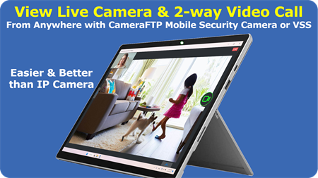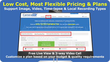 Para utilizar un teléfono inteligente o una tableta como cámara de seguridad, instale la aplicación CameraFTP Mobile Security Camera; Para utilizar la cámara web como cámara de seguridad, instale el software CameraFTP VSS. También puede utilizar la PC como sistema CCTV NVR instalando CameraFTP VSS, ahorrando el costo de comprar un NVR. La vista en vivo y la función de videollamada/audio bidireccional son compatibles con la aplicación de cámara de seguridad móvil y el software VSS. Es totalmente gratis. Ver cámaras públicas/compartidas también es gratis. El servicio de grabación en la nube muy limitado es gratuito. Opcionalmente, puede solicitar un plan de servicio de grabación en la nube de bajo costo a partir de solo $1,50-$2,50/cámara/mes. La grabación en la nube es más segura que la grabación local, ya que un intruso no puede destruir el metraje grabado.