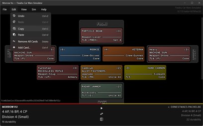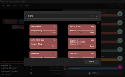 Quickly build, modify, save, and share Car Wars (6e) builds. Simulate builds against virtual competitors to hone the perfect configuration before your next game night.
