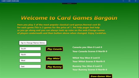 This is the card game bargain of the year giving you Classic Canasta, 500 Rummy and Bid Whist for only $4.99. Normal cost for each of the 3 games is around $5. When you download from the Windows Store you get a free 7 day trial to see how good the games are and at the end of that time the store will ask if you wish to buy or not., It could be an ideal present for friends or maybe the older members of your family