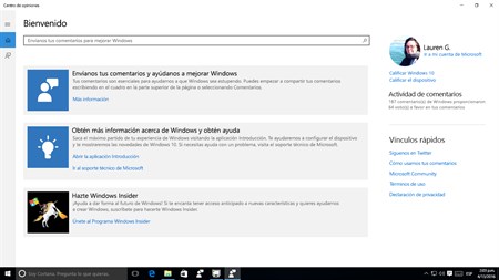 Ayúdanos a mejorar Windows. Proporciona comentarios sobre Windows y aplicaciones compartiendo sugerencias o problemas. Si quieres involucrarte aún más, únete al Programa Windows Insider y mantente al día con las últimas alertas y anuncios, califica las compilaciones, participa en tareas de comentarios y consigue distintivos.