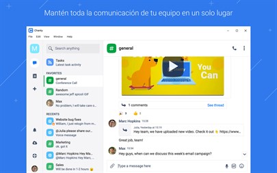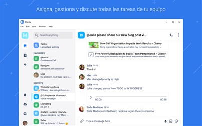Tus razones para empezar a usar Chanty - Historial de mensajes ilimitado - Canales ilimitados (Públicos, Privados e Individuales) - Tareas ilimitadas - Gestión avanzada de roles y permisos - Libro de Equipo con miembros, tareas, conversaciones y todo el contenido compartido - @Menciones para usuarios y para el equipo - Posibilidad de fijar mensajes importantes - Invitación de miembros con un solo clic - Acciones eficaces para los canales - Acciones y reacciones para los mensajes - Reproductor integrado de contenido multimedia - Previsualización de enlaces y archivos - Búsqueda instantánea de mensajes, archivos y otro tipo de cotenido - Uso fluído de archivos compartidos - Notificaciones eficaces - Perfiles para miembros del equipo - Estados en línea - Emojis adorables - Aplicaciones multiplataforma - Soporte 24 horas, 7 días de la semana