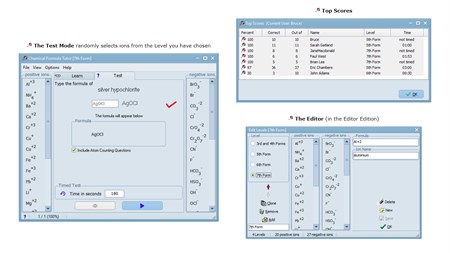 Learn to write chemical formulas by dragging and dropping ions to balance in the Learn Mode. This edition has 4 Levels to work at. The Editor Edition allows cloning, adding deleting modifying and renaming of levels.