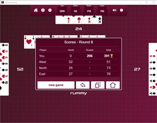 You can customise Classic Rummy to make it the perfect game for you. Choose your win target, choose the number of players, choose a stock reset option (reset, shuffle or block rummy), set whether you must lay down a meld before laying off and choose your play level – easy or hard.