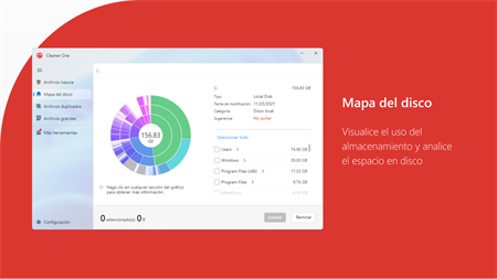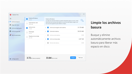 El mejor limpiador de PC gratuito de 2024. Limpie archivos basura, cache, archivos temporales, archivos duplicados inservibles y optimice su PC para obtener un mejor rendimiento con solo unos pocos clics. Compruebe fácilmente el uso de la memoria y la velocidad de Internet en tiempo real. Limpiadores alternativos de CCleaner, Clean Master y Total PC Cleaner. Cleaner One ayuda a eliminar de forma segura los archivos basura y los archivos duplicados inservibles y optimiza su PC para aumentar su rendimiento. Es más fácil limpiar y acelerar el equipo Windows. Dado que se trata de una de las herramientas de optimización y limpieza de PC más potentes y fundamentales, Cleaner One está diseñado con una interfaz de usuario sencilla e intuitiva, adecuada para usuarios con cualquier nivel de conocimientos. Funciones principales: limpieza de archivos basura, buscador y eliminador de archivos duplicados, analizador de archivos grandes y analizador de espacio en disco. ## Limpieza de archivos basura • Explorar y elimine archivos basura, incluidos archivos de la memoria caché, archivos de registro y archivos temporales. • Borre la caché del explorador, las cookies y el historial para proteger su privacidad. Se admiten varios exploradores, incluidos Internet Explorer, Edge, Chrome y Firefox • Mantenga limpio su PC y mejore su rendimiento ## Buscador y eliminador de archivos duplicados • Busque archivos duplicados que se amontonan en el disco duro • Ordene y organice los resultados de la exploración por nombre y tamaño de archivo • Seleccione rápidamente y elimine por lotes los archivos duplicados inservibles ## Analizador de archivos grandes • Busque archivos y carpetas grandes de forma rápida en el almacenamiento local o extraíble • Identifique el contenido que está ocupando espacio en disco • Localice y elimine de forma segura archivos grandes y no utilizados para liberar más espacio en disco ## Mapa del disco • Analice su uso del almacenamiento en un mapa visual e interactivo • Vea un desglose por código de colores de cada carpeta del disco, con información detallada en un solo clic Puede eliminar de forma selectiva los archivos y carpetas de las siguientes categorías: - Archivos basura del sistema - Los archivos basura del explorador, incluidos Google Chrome, Microsoft Edge, Microsoft Internet Explorer y Mozilla Firefox - Archivos basura de aplicaciones - Archivos descargados - Papelera de reciclaje