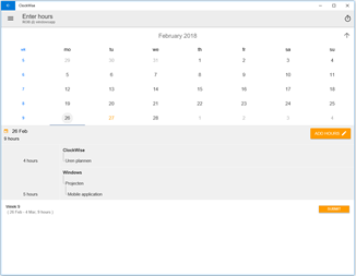 This Windows app can be used to access an existing clockwise account. With this app you can write hours and submit weeks from any location.