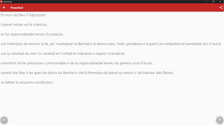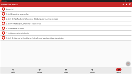 Esta aplicación contiene la Constitución de Suiza en inglés, francés, italiano, español y alemán.