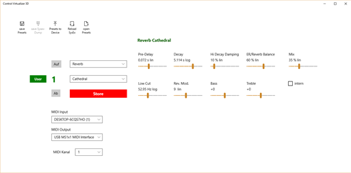 The App controls Multieffect Device Virtulaizer 3D FX2000 by Behringer via MIDI-Interface. You can easy set the effects parameters, store and recall presets at the PC. It's also possible to recieve and save Memory-Dumps of the Virtualizer 3D whith the app and reload them to the device.