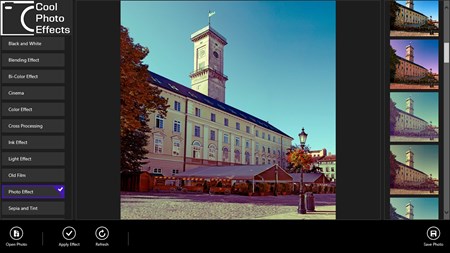 More than 300 original and exclusive effects for your photos ! Enhance your photos and apply professional finish with one click! Cool Photo Effects is very easy to use. Simply select an effect from the proposed categories: - Black and White - Bi-Color Effect - Blending Effect - Cinema - Color Effect - Cross Processing - Ink Effect - Light Effect - Old Film - Photo Effect - Sepia - Textures and Scratches - Vignette Apply multiple effects to create fantastic photos. You will like to grant your photo interesting and unique effects. The result will exceed your expectations.