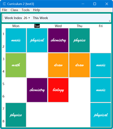 The software is used to record multi-user class schedules. ※ elevate permission if crashes You can customize the number of classes per day, whether to display weekends, interface background and fonts. Course data is independent of software, easy to share between users, support import and export excel files. For each course, you can set the class time, single or double week, the number of starting and ending weeks, the current week, temporary mediation and class notes.