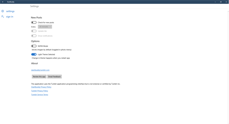 * Able to post to multiple blogs in the same account * recent notes and reblog information. * list of blogs you're following * follow / unfollow ability * can check regularly to see if you have new posts * pin your favourite blogs to your start screen * pin new post screens to your start screen for even easier posting!