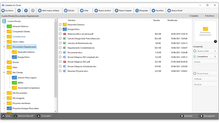 Para compartir archivos con los clientes el sistema crea una web propia para cada cuenta. Los clientes pueden acceder a las carpetas que les han sido compartidas. Además existen varias formas de compartir los documentos e incluso las carpetas completas, nunca es necesario que el cliente tenga que instalar la aplicación. Se pueden enviar enlaces de acceso y por email.