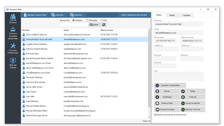 Por seguridad y control, distingue entre los usuarios internos de la empresa y los externos. Los usuarios externos son llamados Usuarios Web, que en realidad son los clientes. Aunque debemos aclarar que como Dataprius es utilizado en multitud de sectores, para cada actividad estos usuarios pueden denominarse de diferentes formas como: pacientes, en el caso de del sector sanitario, alumnos en el ámbito académico, etc.
