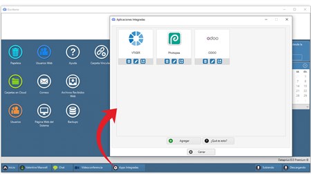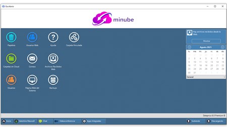 El entorno dispone de su propio escritorio que facilita una sencilla gestión del sistema en cuanto a usuarios y permisos, emails enviados, archivos recibidos de los clientes, aplicaciones integradas, videoconferencia, chat, backups, calendario.