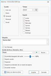Este reloj despertador puede despertar su sistema desde el modo de suspensión. La computadora se despertará y se reproducirá un sonido de alarma. Es posible que esta función no funcione en algunas PC. También es necesario que la solicitud de contraseña para iniciar sesión en el sistema esté desactivada.