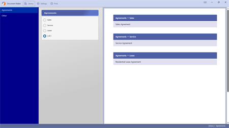 The current version of the app includes Sales Agreement, Motor Vehicle Bill of Sale, Service Agreement, Residential Lease Agreement, Power of Attorney and Letter Template.