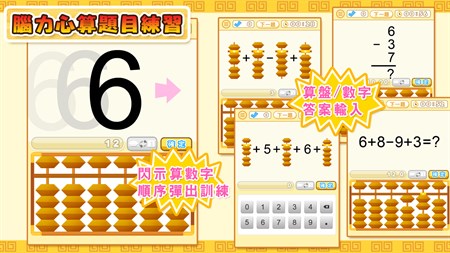 腦力心算題目練習(繁體中文,粵語/國語發音),提供珠心算訓練的閃示(暗算)及聽算題目。同時提供針對珠心算的四個加法要訣及四個減法要訣的題目鍛鍊。