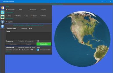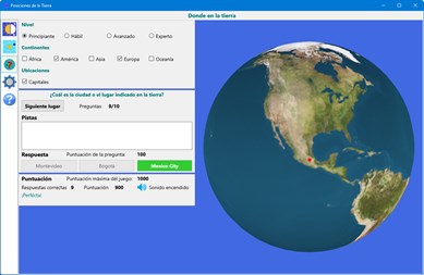 3. Donde en la Tierra Un juego geográfico muy atractivo, en el que tienes que adivinar una ubicación en una Tierra 3D, que gira y da vueltas para mostrar esa ubicación en el medio. Este juego contiene 4 niveles (principiante, habilidoso, avanzado y experto), 5 continentes (África, América, Asia, Europa y Oceanía) y 4 grupos (capitales, grandes ciudades, pueblos y aeropuertos). Dependiendo del nivel del juego, puede seleccionar su respuesta entre 3, 6, 9 o 12 ubicaciones. Puede obtener ayuda adicional solicitando hasta tres sugerencias. Sin embargo, una pista reduce los puntos que puede ganar al responder la pregunta.