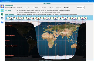 Esta aplicación muestra tres funciones animadas sobre las posiciones de la Tierra: 1. Día y Noche La aplicación muestra esta animación al iniciarla. Muestra una forma en movimiento de la zona nocturna sobre el mapa de la Tierra. También muestra la hora en diferentes posiciones de la Tierra y las luces de la ciudad de las capitales y algunas grandes ciudades por la noche. Al inicio, la animación muestra el día actual, pero se puede seleccionar cualquier fecha para observar cómo la forma de la noche cambia durante la temporada, por ejemplo, 21 de marzo, 21 de junio, 21 de septiembre y 21 de diciembre.