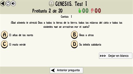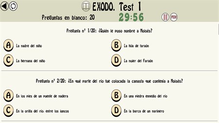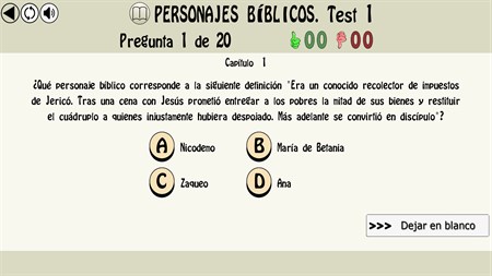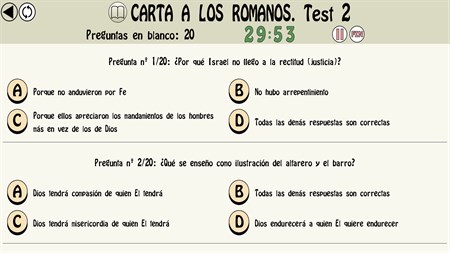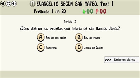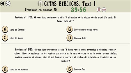 - Diferentes tipos de preguntas: - Sobre el antiguo testamento: Génesis, Éxodo, Levítico, Números, Deuteronomio, Josué, Jueces, Libro de Samuel, Libro de los Reyes, Joel, Abdias, Jonas, Nahum, Habacuc, Sofonias, Rut, Esther, Daniel, Esdras, Nehemias, Judit, tobias, Libro de los macabeos, Sabiduría, eclesiastico, Baruc, Carta de Jeremías... - Sobre el nuevo testamento: Evangelio San Mateo, Evangelio San Marcos, Evangelio San Lucas, Evangelio San Juan, Hechos de los apósteles, Carta a los romanos, Carta a los Corintios, Carta a los Galatas, Carta a los Efesios, Carta a los Filipenses, Carta a los Colosenses, Carta a los Tesalonicienses, Carta a Timeteo, Carta a Tito, Carta a Filemón, Carta a los Hebreos, Carta de Santiago, Carta de San Pedro, Carta de San Juan, Carta de San Judas, Apocalipsis... - Sobre personajes bíblicos. - Sobre citas bíblicas - Más de 500 Test. - 7.000 Preguntas. - Dos modos de realizar un mismo test (modo de respuesta instantánea o modo examen). - Estadísticas de los test realizados.