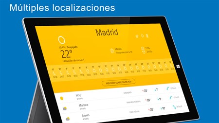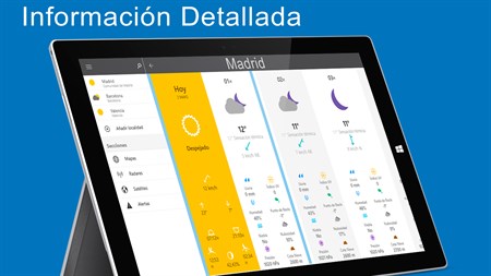 El tiempo de tu ciudad. Predicción por horas, mapas, radares, alertas y Live Tile. El Tiempo 14 días es la aplicación líder desarrollada íntegramente en España con más de 12 millones de descargas, totalmente GRATUITA e información meteorológica para España y el resto del mundo. Compatible con cualquier teléfono o tablet de cualquier versión de Microsoft Windows. App oficial de Tiempo.com, preferida por los aficionados a la meteorología, con previsiones meteorológicas propias y más de 15 años de experiencia. Cuenta con un diseño moderno basado en Material Design para que consultar el tiempo sea rápido y sencillo.