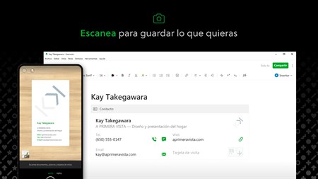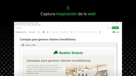 CAPTURA IDEAS • Escribe, recopila y captura ideas como notas, libretas, y listas de tareas fáciles de buscar. • Captura artículos y páginas web interesantes para leerlos o utilizarlos más adelante. • Añade distintos tipos de contenido a tus notas: texto, documentos, archivos PDF, dibujos, fotos, audio, capturas web y mucho más. • Utiliza tu cámara para escanear y organizar documentos en papel, tarjetas de visita, pizarras y notas escritas a mano.