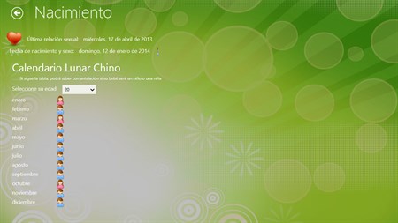 Fertility Calendar le ayuda a quedarse embarazada o prevenir el embarazo calculando los períodos mensuales de su máxima fertilidad y controlando su ciclo menstrual. Teniendo un calendario de ovulación, puede ver e imprimir el calendario de sus días más seguros y de sus días más fértiles. ¿Planifica un bebé? Un calendario de ovulación le puede ayudar a aumentar la probabilidad de concebir un niño o una niña, pronosticando el sexo de su bebé en base a la información sobre su posición dentro del ciclo de ovulación. ¿Está cansada de pastillas y otros contraceptivos? Con un calendario de ovulación puede utilizar el método más seguro y natural de contracepción. Una vez introducida su información de menstruación, su calendario personal de ovulación le visualizará todos sus días seguros (poca probabilidad de quedarse embarazada) y sus días fértiles (cuando la posibilidad de quedarse embarazada es alta) en una cuadrícula multicolor con sus períodos seguros y fértiles pintados de distintos colores.