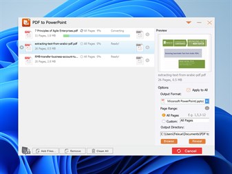 PDF to PowerPoint Converter exports PDF files to editable and modifiable Office PowerPoint documents quickly and efficiently. It convert PDF file back to PowerPoint Presentation with well-preserved original texts, images, layouts, hyperlinks, tables, and bezier graphics.