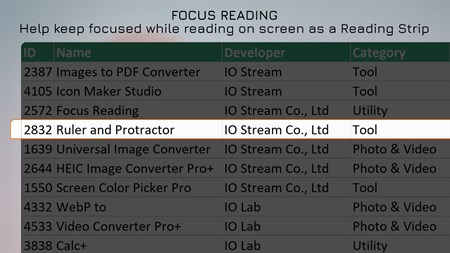 Supports focused reading of each horizontal line by hiding unimportant information. For example, when you want to focus on reading each line in Excel or any type of document.