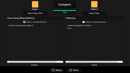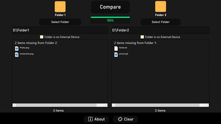 Folders2Check is a desktop app used for comparing the files/folders from two different folders and drives. Items missing from the folders are displayed in the app. Folders2Check can be used to compare folders on computers and external devices such as mobile phones.