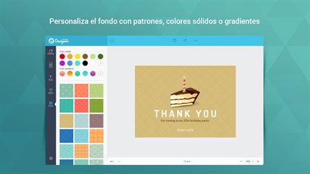 Guarda o comparte • Guarda tu diseño como imagen JPG o PNG. • Compártelo en Facebook, Twitter, Pinterest o Tumblr. • Guarda tu proyecto y cárgalo más tarde para seguir editando.