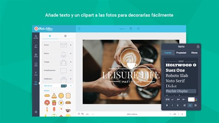 Añade otros elementos para resaltar tu foto • Añade nuevo texto a tu foto o aplica más de 30 estilos de texto preestablecidos rápidamente. • Ajusta la opacidad, la fuente, el color, el tamaño, la alineación y el efecto del texto a voluntad. • Elige entre más de 800 imágenes clipart listas para usar o busca a través de más de 93.000 imágenes online. • Personaliza libremente las imágenes clipart a tu gusto. • Elige entre más de 70 superposiciones suaves y personalízalas ajustando la intensidad, el modo de mezcla, el giro y el volteo. • Aplica más de 40 tipos distintos de marcos incluyendo Borde, Sombra, Polaroid, Margen, Película, etc. • Mueve, gira, redimensiona y duplica libremente los elementos.