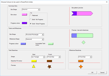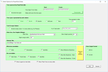 You enjoy full flexibility in choosing which lines will be sent to PowerPoint. You have complete control over what time period will be covered by the slides and over the annotation of bars and milestones, including choosing the colours to be used by PowerPoint.
